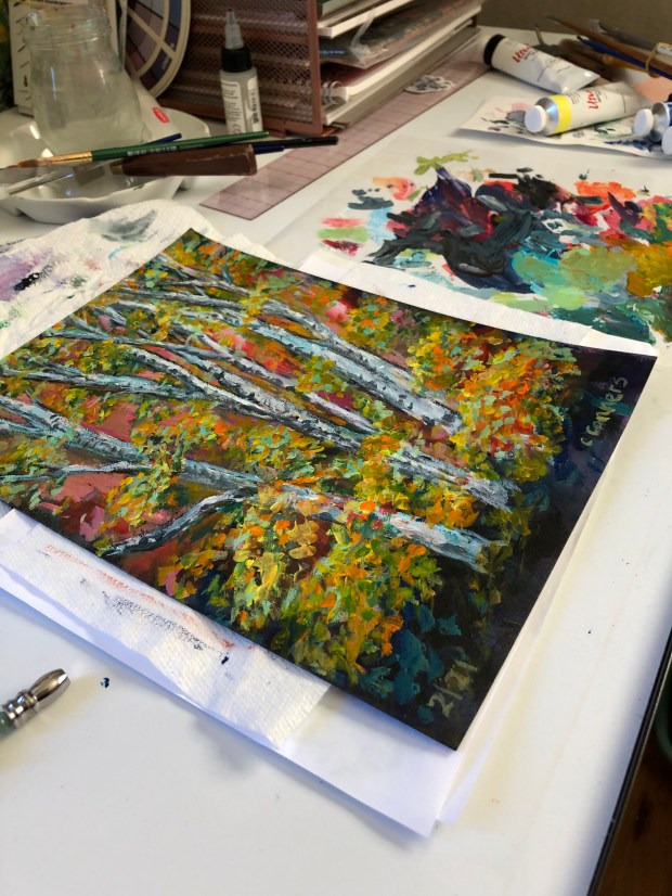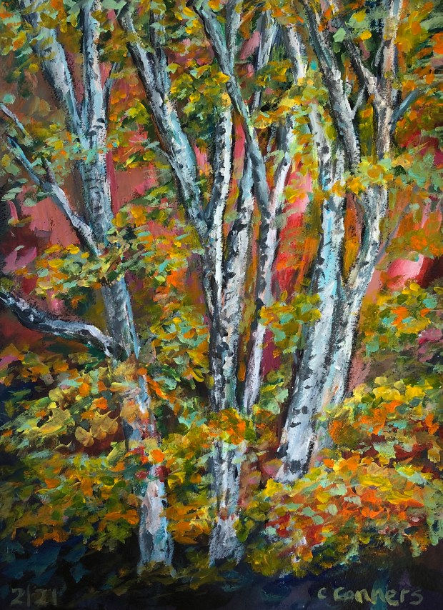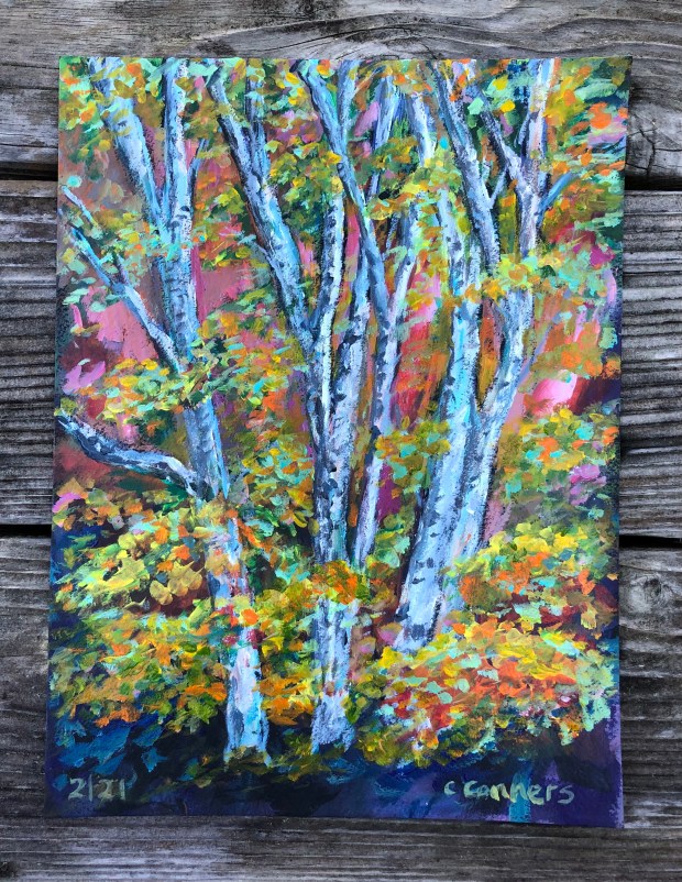 Last night was Friday Night Live with Acrylic University host Jed Dorsey who was joined remotely by special guest artist, Dianna Shyne – two artists painting from a photograph of trembling aspen trees in Prince Edward Island, Canada. I participated and painted along with others as we listened to the artists talk. It was so much fun!