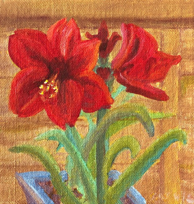 April Amaryllis 6″ x 6″ Acrylic This amaryllis is now blooming in our garden shed. Share this: Click to share on X (Opens in new window) X Click to share on Facebook (Opens in new window) Facebook Like Loading...