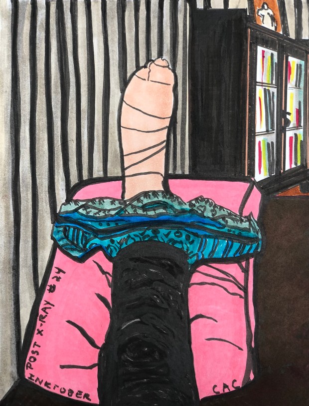 Post X-ray and post-op. Two pins in two toes with 17 stitches. An ice pack is nice and offers relief.