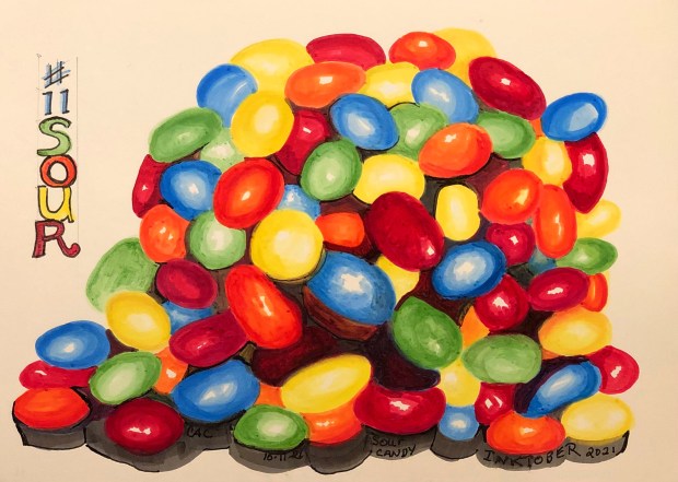 TRI-BLEND Spectrum Noir in light green, orange, citrus, dark red, light yellow, true blue blends, Copic toner gray, and Sakura Micron.