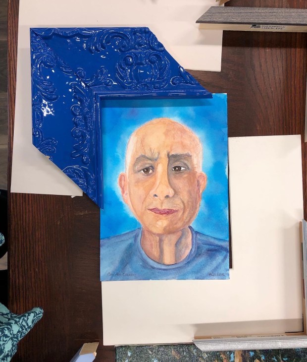 We chose this bold blue frame by Roma Moulding for this watercolor portrait of Greg.