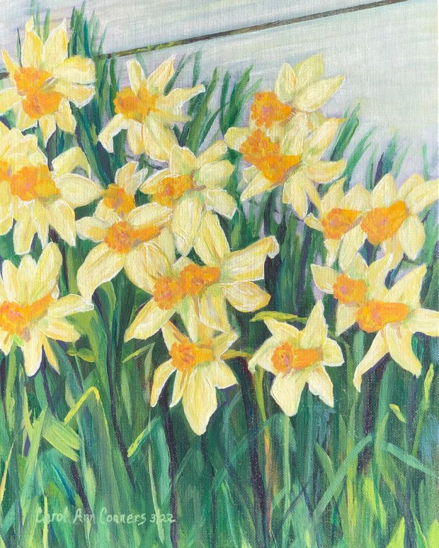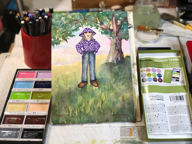 I set up my limited color palette using the following colors: titanium white, cadmium medium yellow, quinacridone red, quinacridone magenta, ultramarine blue, pthalo blue, and indanthrene blue.