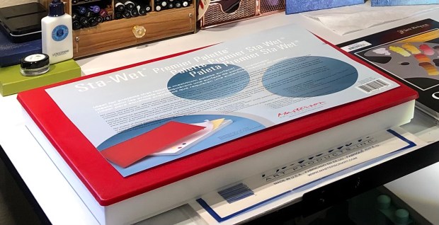 Painting with heavy body acrylic paint is a much different experience than painting with watercolor paint. Acrylic painting is much messier! The paints dry fast. To keep the paints from drying out, I am going to use Masterson Premier Pallet which has a machine washable sponge to keep the paint from drying out. We shall see if this truly does keep the paint from drying out.