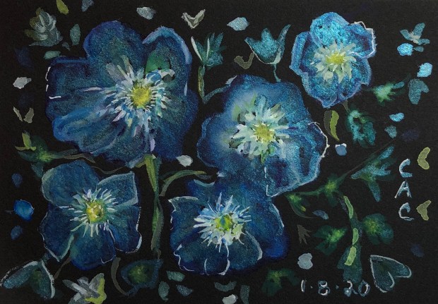 I am trying out this new black watercolor paper made by Stongehenge and FineTec Metallic Blue watercolor paint. They were part of the January Box from Sketchbox.